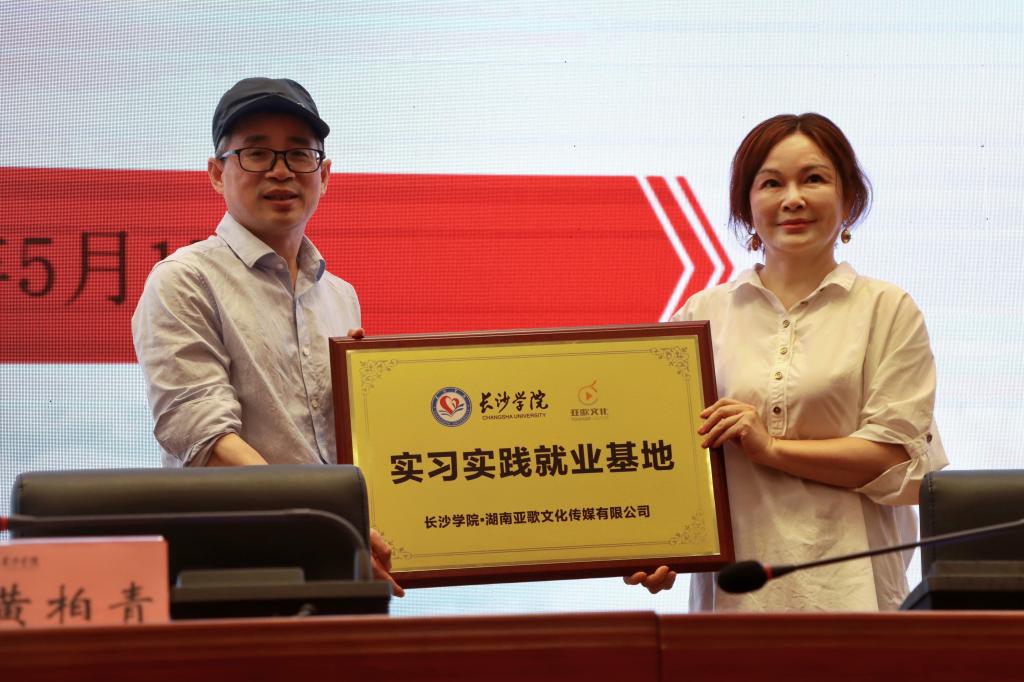 讲座开始前,我院与湖南亚歌文化传媒有限公司举行了校企战略合作暨实习实践就业基地共建签约仪式,黄柏青院长与甘琼教授签订校企合作战略协议,双方并进行了实践就业基地共建互授牌匾。